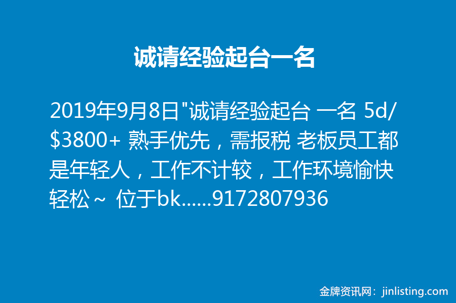 “诚请经验起台 一名 5d/$3800+ 熟手优先,需报税 老板员工都是年轻人, 工作不计较, 工作环境愉快轻松~ 位于bk下城 15-20分钟地铁八大道,法拉盛接送 联系方式 9172807936 如未接请发短信留下基本资料 期待您的加入”