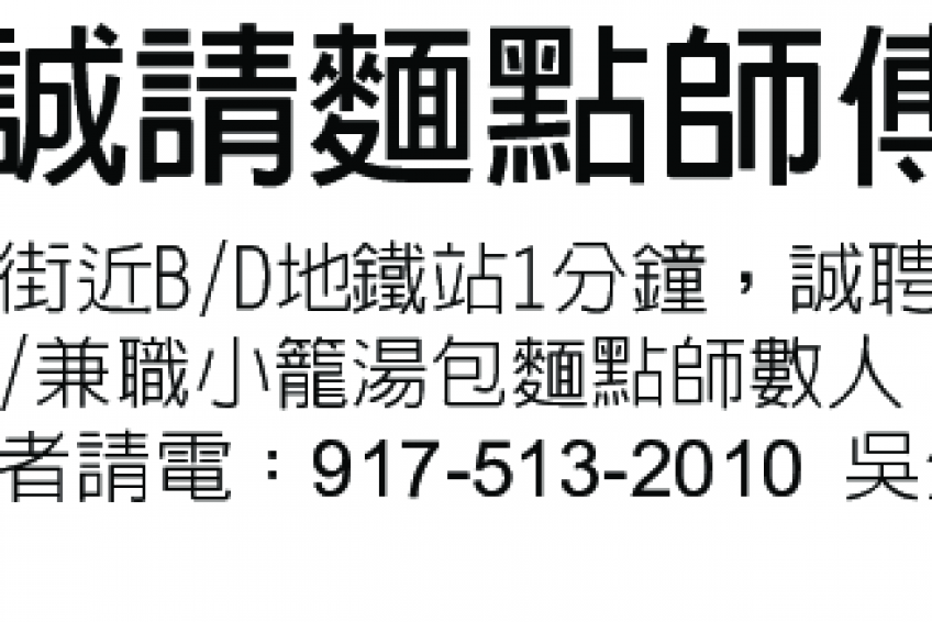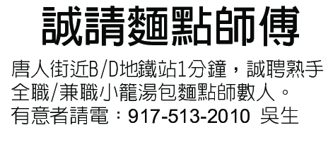 唐人亍近B,D地鐵站1分鐘,誠聘熟手全職,兼職小籠湯包、麵點師數人,有意者請電:917-513-2010 吳生