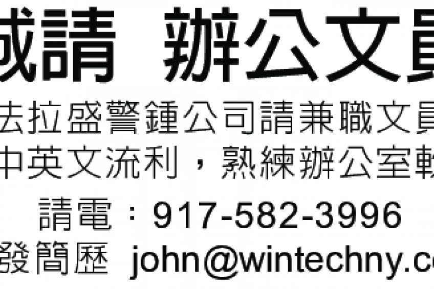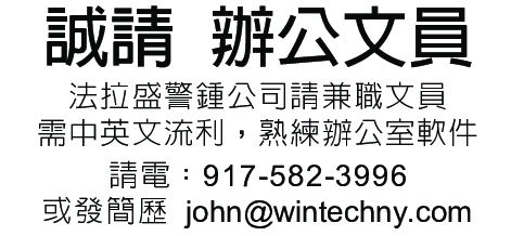 法拉盛警钟公司请兼职文员, 需中英文流利,熟练办公室软件, 电 917-582-3996,或发简历 john@wintechny.com