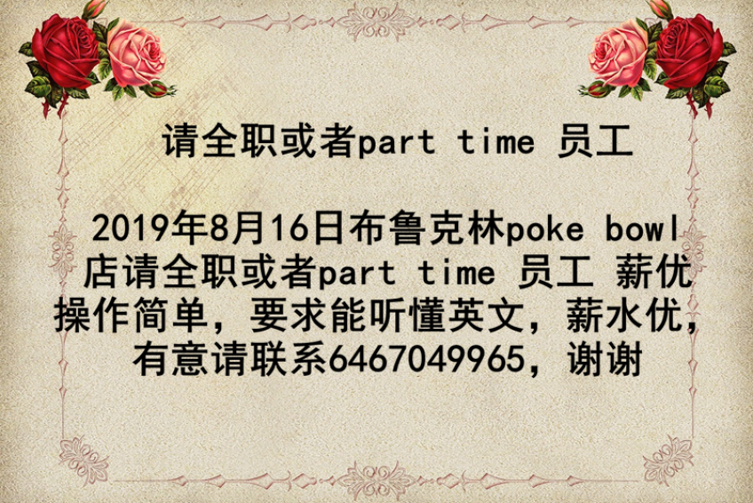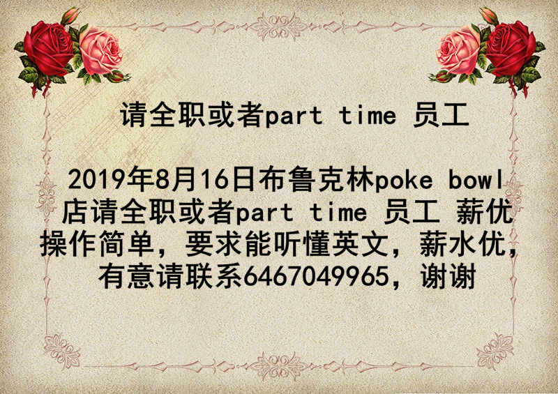布鲁克林poke bowl 店请全职或者part time 员工 薪优 操作简单,要求能听懂英文,薪水优,有意请联系6467049965,谢谢