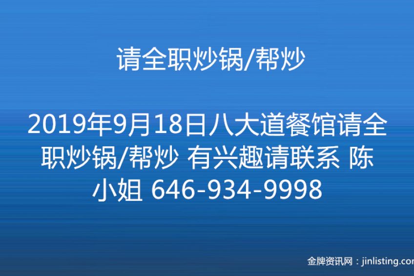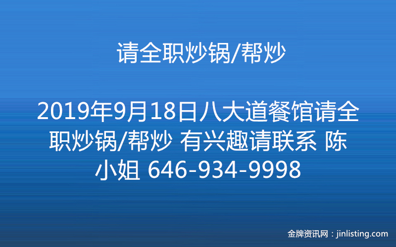 八大道餐馆请全职炒锅/帮炒 有兴趣请联系 陈小姐 646-934-9998