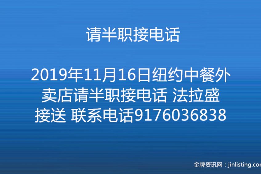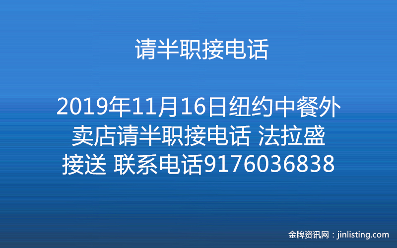 纽约中餐外卖店请半职接电话 法拉盛接送 联系电话9176036838