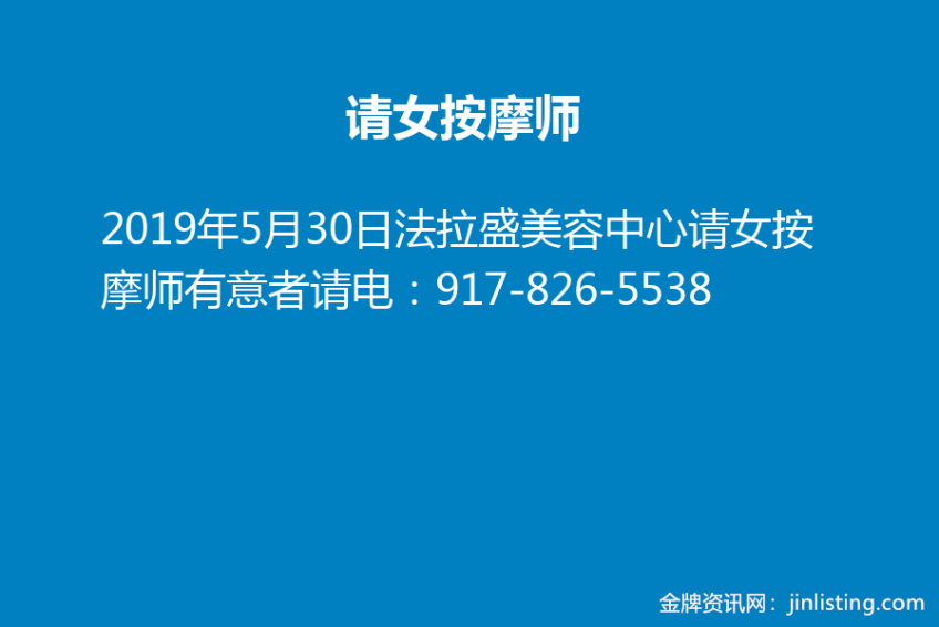 法拉盛美容中心请女按摩师有意者请电:917-826-5538