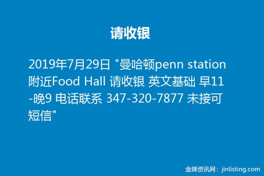 “曼哈顿penn station附近Food Hall 请收银 英文基础 早11-晚9 电话联系 347-320-7877 未接可短信”
