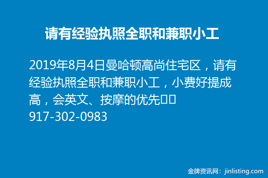 曼哈顿高尚住宅区,请有经验执照全职和兼职小工,小费好提成高,会英文、按摩的优先☎️917-302-0983