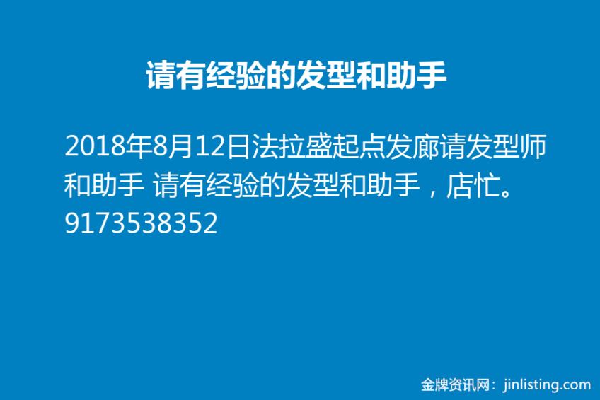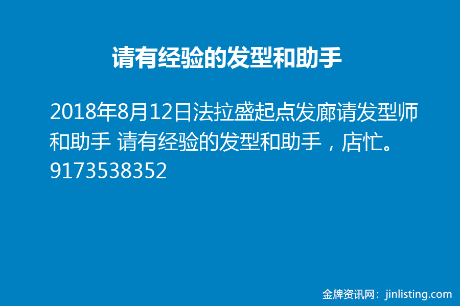 法拉盛起点发廊请发型师和助手 请有经验的发型和助手,店忙。9173538352