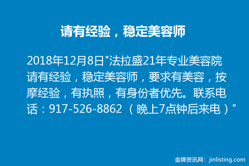 “法拉盛21年专业美容院请有经验,稳定美容师,要求有美容,按摩经验,有执照,有身份者优先。 联系电话:917-526-8862 (晚上7点钟后来电)”