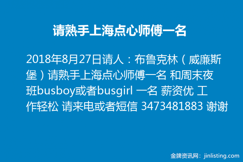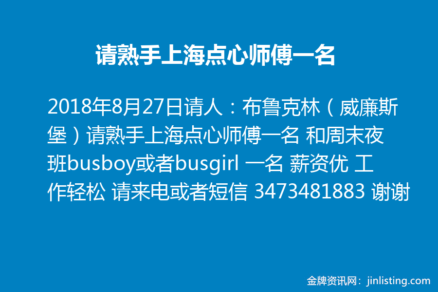 请人:布鲁克林(威廉斯堡)请熟手上海点心师傅一名 和周末夜班busboy或者busgirl 一名 薪资优 工作轻松 请来电或者短信 3473481883 谢谢