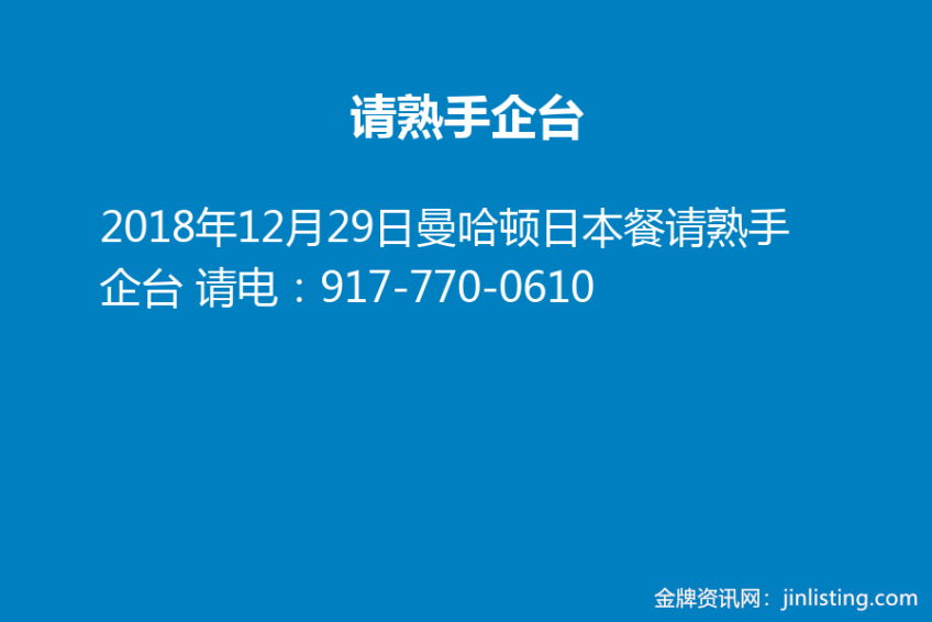 曼哈顿日本餐请熟手企台 请电:917-770-0610