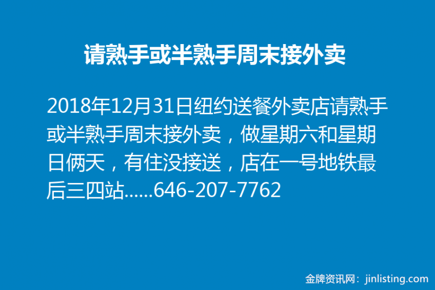 纽约送餐外卖店请熟手或半熟手周末接外卖,做星期六和星期日俩天,有住没接送,店在一号地铁最后三四站,唐人街坐地铁一小时到,有意者打电话646-207-7762,熟手工资130一天,要有外卖店接外卖工作经验俩年以上,半熟手120一天,要有外卖店接外卖工作经验一年以上