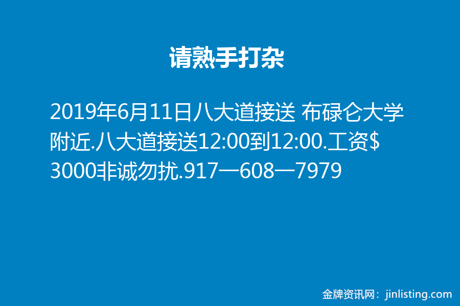 请熟手打杂 八大道接送 布碌仑大学附近.八大道接送12:00到12:00.工资$3000非诚勿扰.917一608一7979