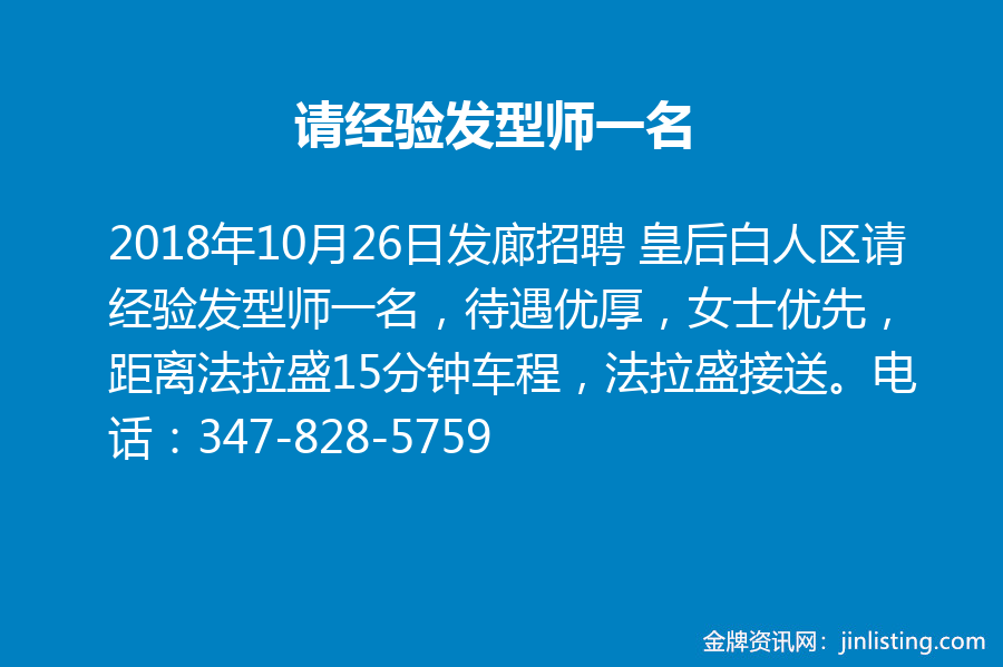 发廊招聘 皇后白人区请经验发型师一名,待遇优厚,女士优先,距离法拉盛15分钟车程,法拉盛接送。电话:347-828-5759