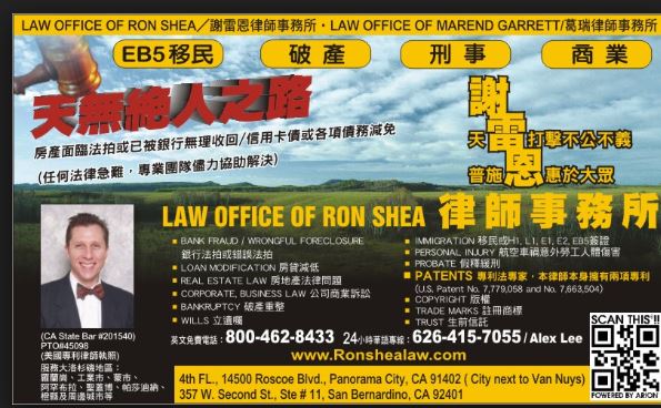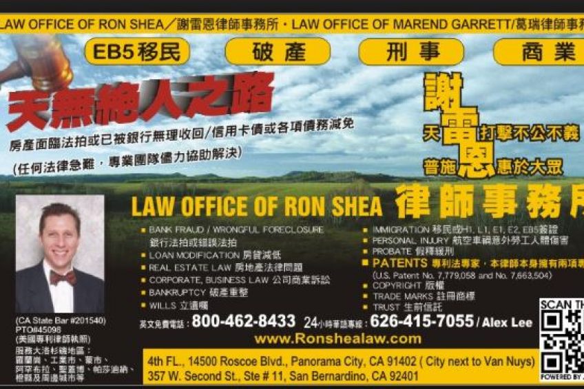 谢雷恩律师事务所 – Law Office of Ron Shea 移民,商业诉讼,人身伤害,家庭法,人体伤害 626-415-7055、800-462-8433