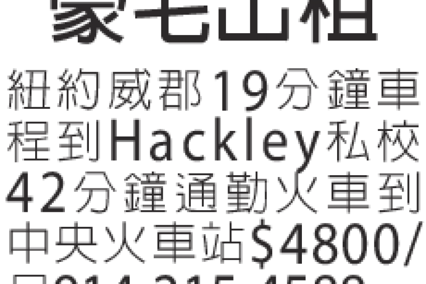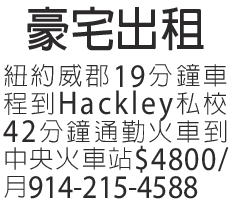 紐約威郡19分鐘車程到Hackley私校42分鐘通勤火車到中央火車站月租$4800