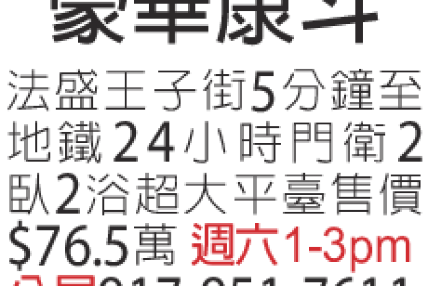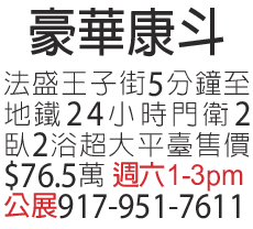 法拉盛中心王子街5分鐘至地鐵24小時門衛2臥2浴超大平臺售價76萬5千週六1-3pm公展請電718-358-0001或917-951-7611