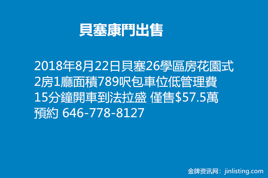 26學區房花園式2房1廳,有游泳池,健身房,低管理費,地稅$2860/年,面積789 呎,包車位,近Ps213小學,74中學,15分鐘開車到法拉盛,僅售$57.5萬,預約   請聯繫經紀  646-778-8127
