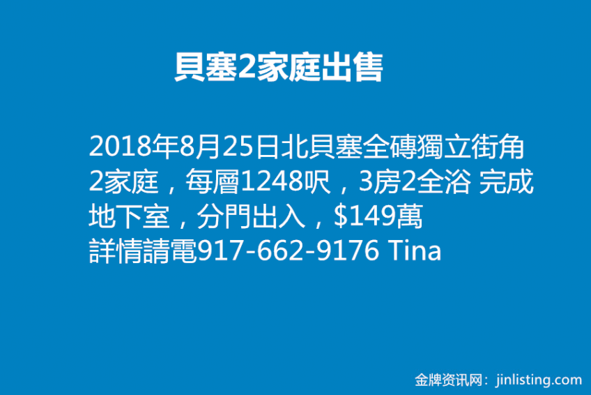 北貝塞全磚獨立街角2家庭,每層1248呎,3房2全浴,完成地下室,分門出入,$149萬