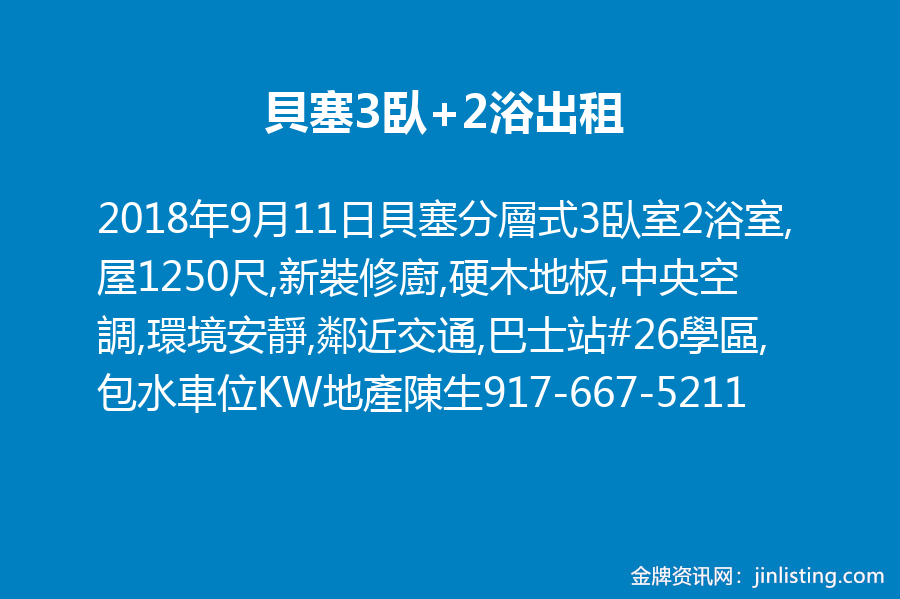 貝塞分層式3臥室2浴室, 屋1250尺, 新裝修廚, 硬木地板, 中央空調, 環境安靜, 鄰近交通, 巴士站#26學區, 近一切 租2500 包水車位KW地產陳生917-667-5211