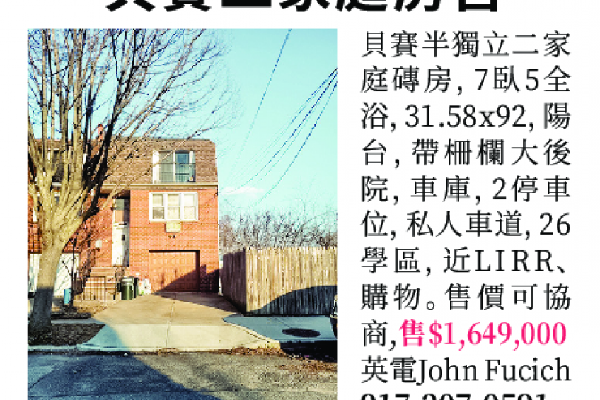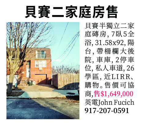 皇后區Bayside,一幢半獨立二家庭磚房, 地段極佳,7臥5全浴,Lots size:31.58 x 92, ,陽台,帶柵欄的大後院,車庫,2 停車位,私人車道,學區 26, 靠近 LIRR,購物,售價:1,649,000 美元(可協商),