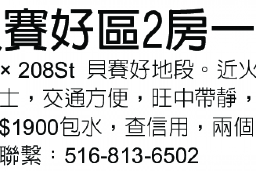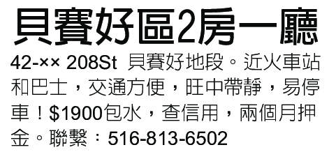 未在市,42-××208St 貝賽好地段。近火車站和巴士,交通方便,旺中帶靜,易停車!$1900包水,查信用,兩個月押金。聯繫516-813-6502