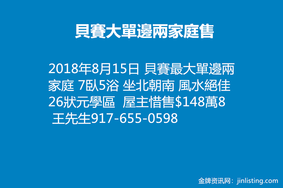 貝賽最大單邊兩家庭售     917-655-0598