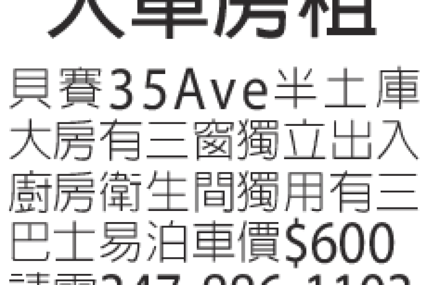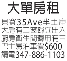 貝賽35Ave半土庫大房有三個窗獨立出入廚房衛生獨用三個巴士可乘昜泊車價格$600電347-886-1103