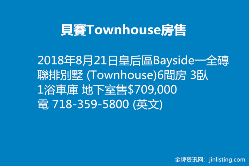 皇后區Bayside, 一全磚聯排別墅 (Townhouse), 6間房, 3臥1浴, 車庫,地下室,好地段,售$709,000, 電:Du Rite Realty-718-359-5800 (英文)