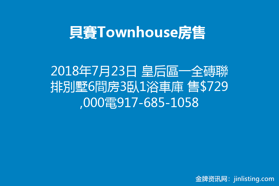 皇后區Bayside, 一全磚聯排別墅 (Townhouse), 6間房, 3臥1浴, 車庫,地下室,好地段,售$729,000, 電:Du-Rite Realty Exclusive – Mrs. K 917-685-1058