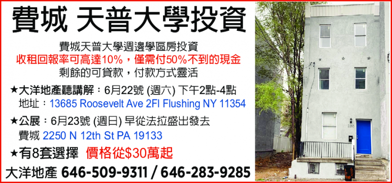 6月22號(週六)中午2點-4點, 歡迎來大洋地產聽講解。 地址在13685 Roosevelt Ave 2Fl Flushing NY 11354