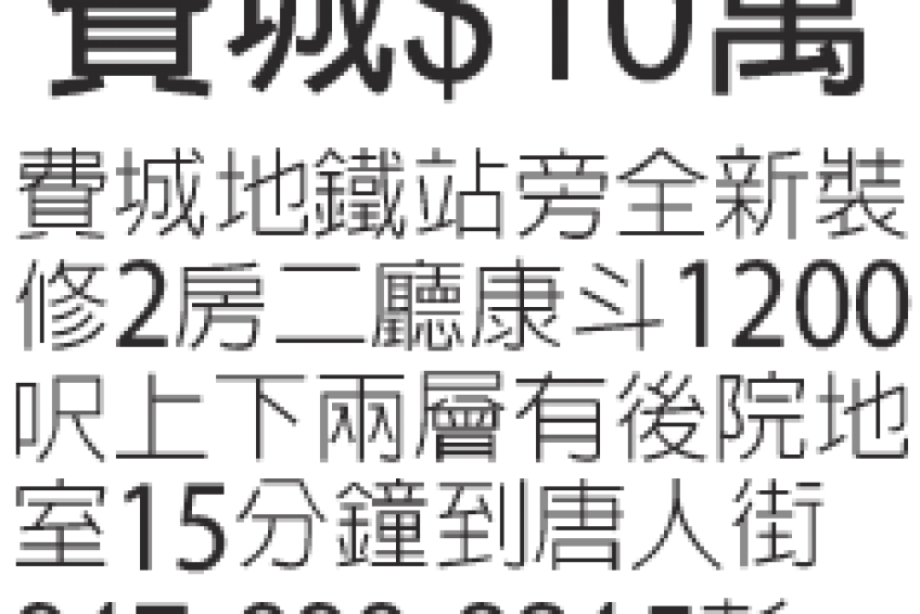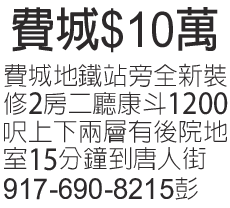 地鐵站旁全新裝修兩房兩廳康鬥1200呎上下兩層有後院地室15分鐘到唐人街917-690-8215彭