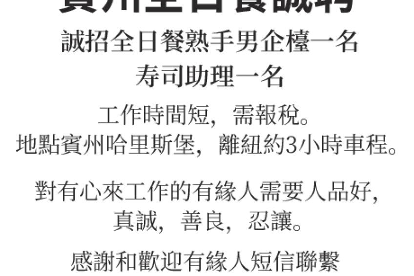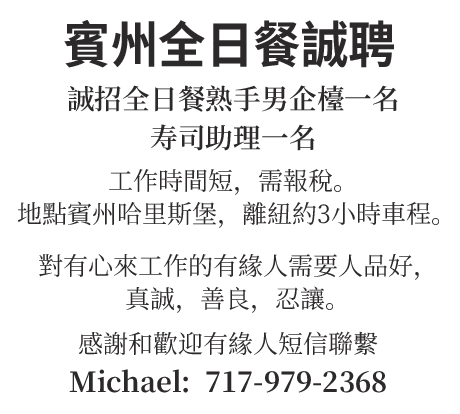 賓州全日餐誠聘