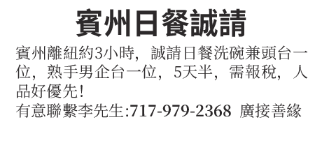 賓州離紐約3小時,誠請日餐洗碗兼頭台一位,
