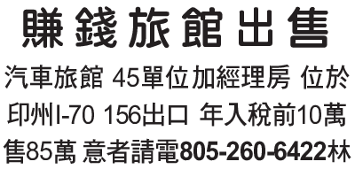 汽車旅館 45單位加經理房 位於印州I-70 156出口 年入稅前10萬 售85萬