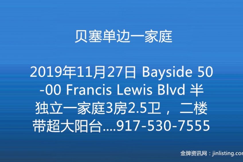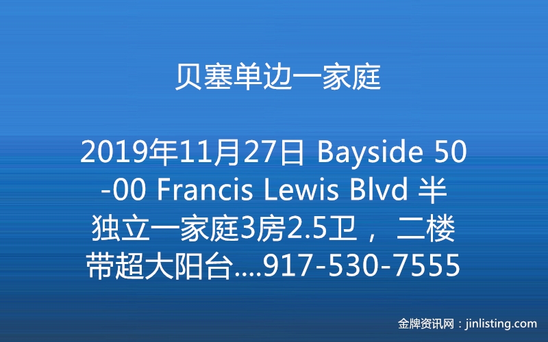 贝塞单边一家庭 Bayside 50-00 Francis Lewis Blvd 半独立一家庭3房2.5卫, 二楼带超大阳台,完成地室,地25×97 屋1366 sqf, 地税$6868。保养佳,近韩国超市H Mart, 交通方便近295 Highway ,Northern Blvd及多种Bus Q27, Q31,Q26,Q76,生活基能强,售$799,000. Paul 917-530-7555
