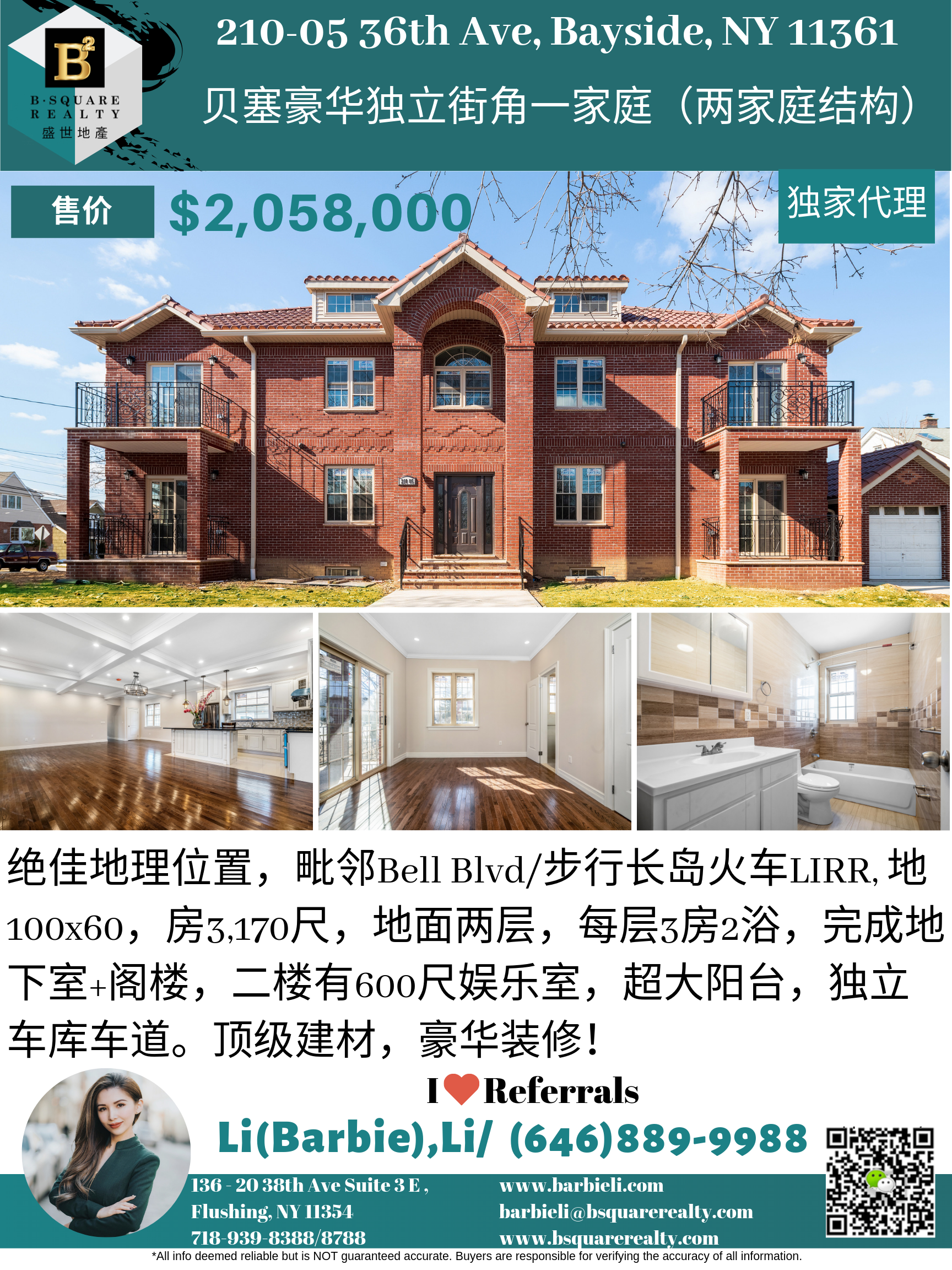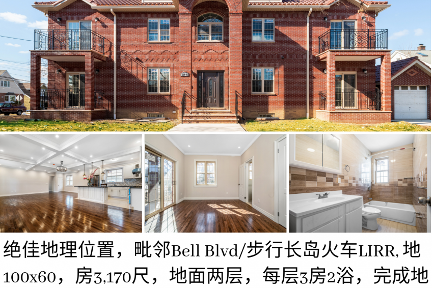贝塞豪华独立街角一家庭(两家庭结构), 绝佳地理位置,毗邻Bell Blvd/步行长岛火车LIRR, 地100×60,房3,170尺,地面两层,每层3房2浴,完成地下室+阁楼,二楼有600尺娱乐室,超大阳台,独立车库车道。顶级建材,豪华装修!有钥匙随时看