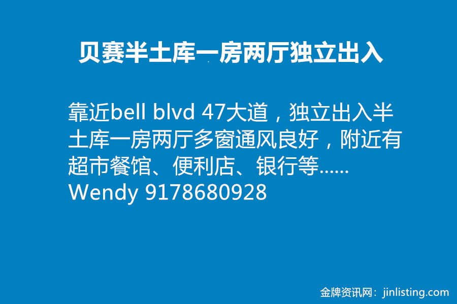 贝赛好区靠近bell blvd 47大道,独立出入半土库一房两厅多窗通风良好,附近有超市,餐馆、便利店、银行等,学校有203小学158中学卡多索高中、QCC,有Q27、Q12、Q31巴士和长岛火车站、QM3巴士直达中城,易泊车生活购物方便,适合无宠物,不吸烟少炊上班族或学生1-2人。联系电话Wendy 9178680928(如果没有人接听请短信)
