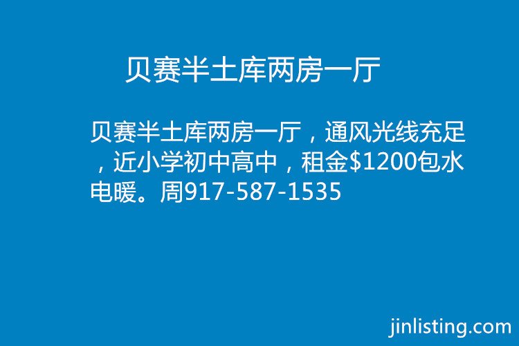 贝赛半土库两房一厅,通风光线充足,近小学初中高中,租金$1200包水电暖。周917-587-1535