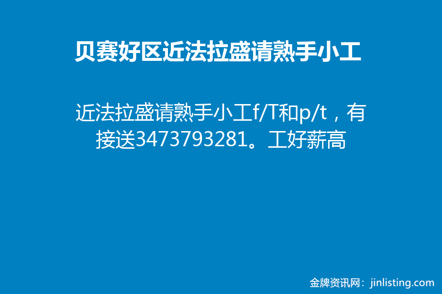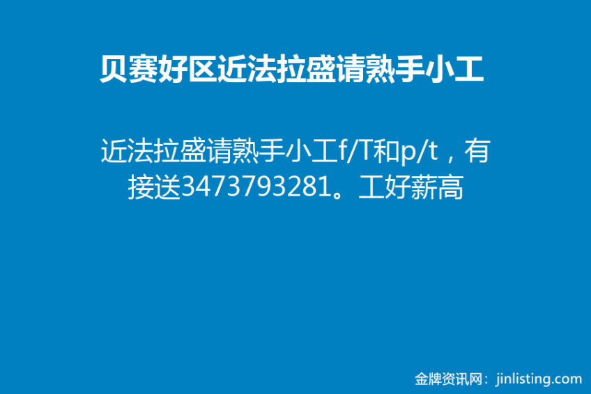 贝赛好区近法拉盛请熟手小工f/T和p/t,有接送3473793281。工好薪高