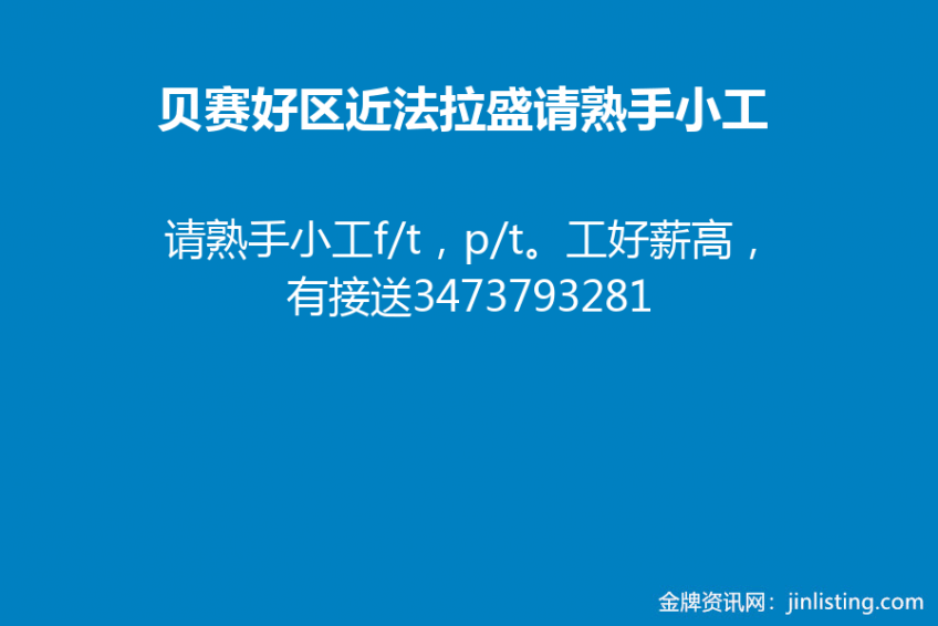贝赛好区近法拉盛请熟手小工f/t,p/t。工好薪高,有接送3473793281