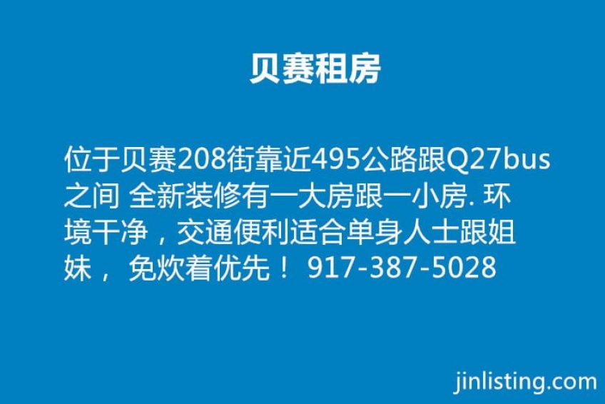 位于贝赛208街靠近495公路跟Q27bus之间 全新装修有一大房跟一小房. 环境干净,交通便利适合单身人士跟姐妹, 免炊着优先! 917-387-5028