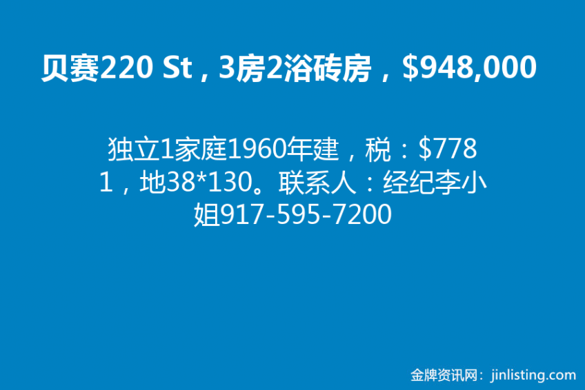 贝赛,220 St , 3房2浴,独立1家庭,砖房,$948,000,1960年建,税:$7781,地38*130。