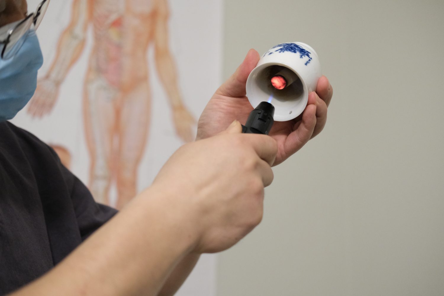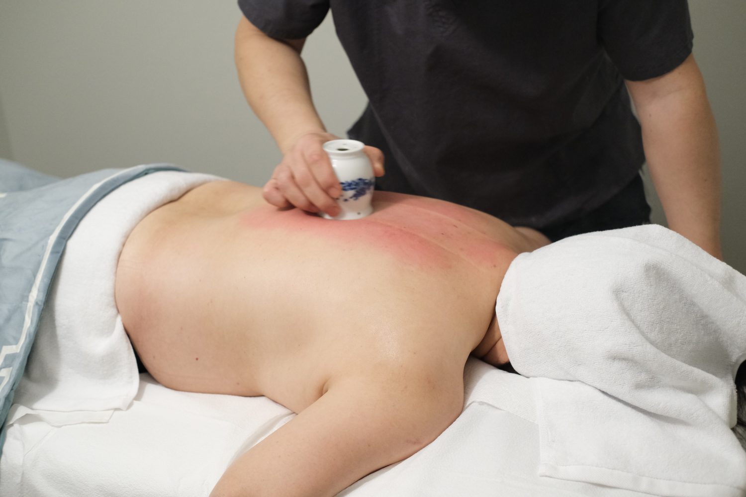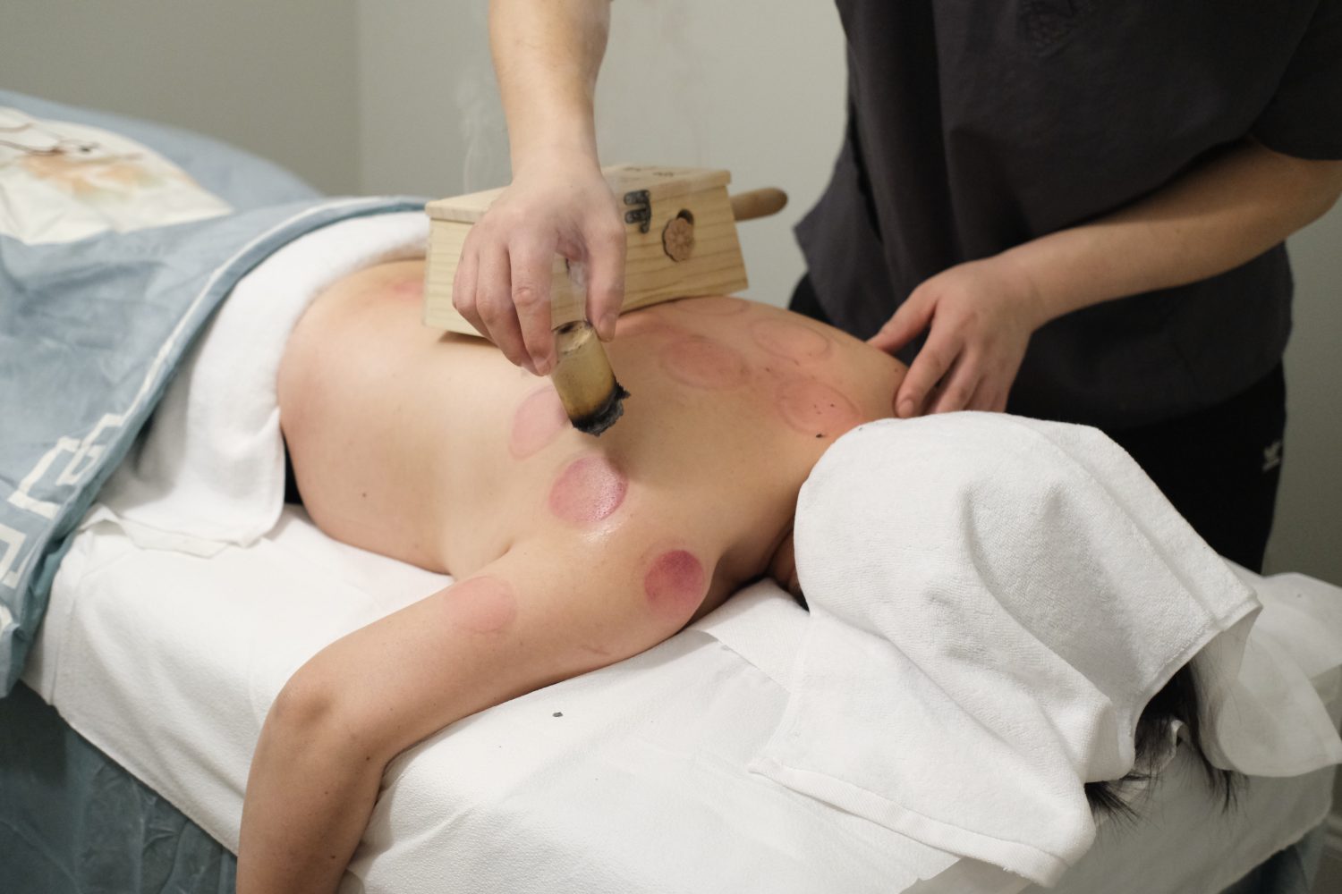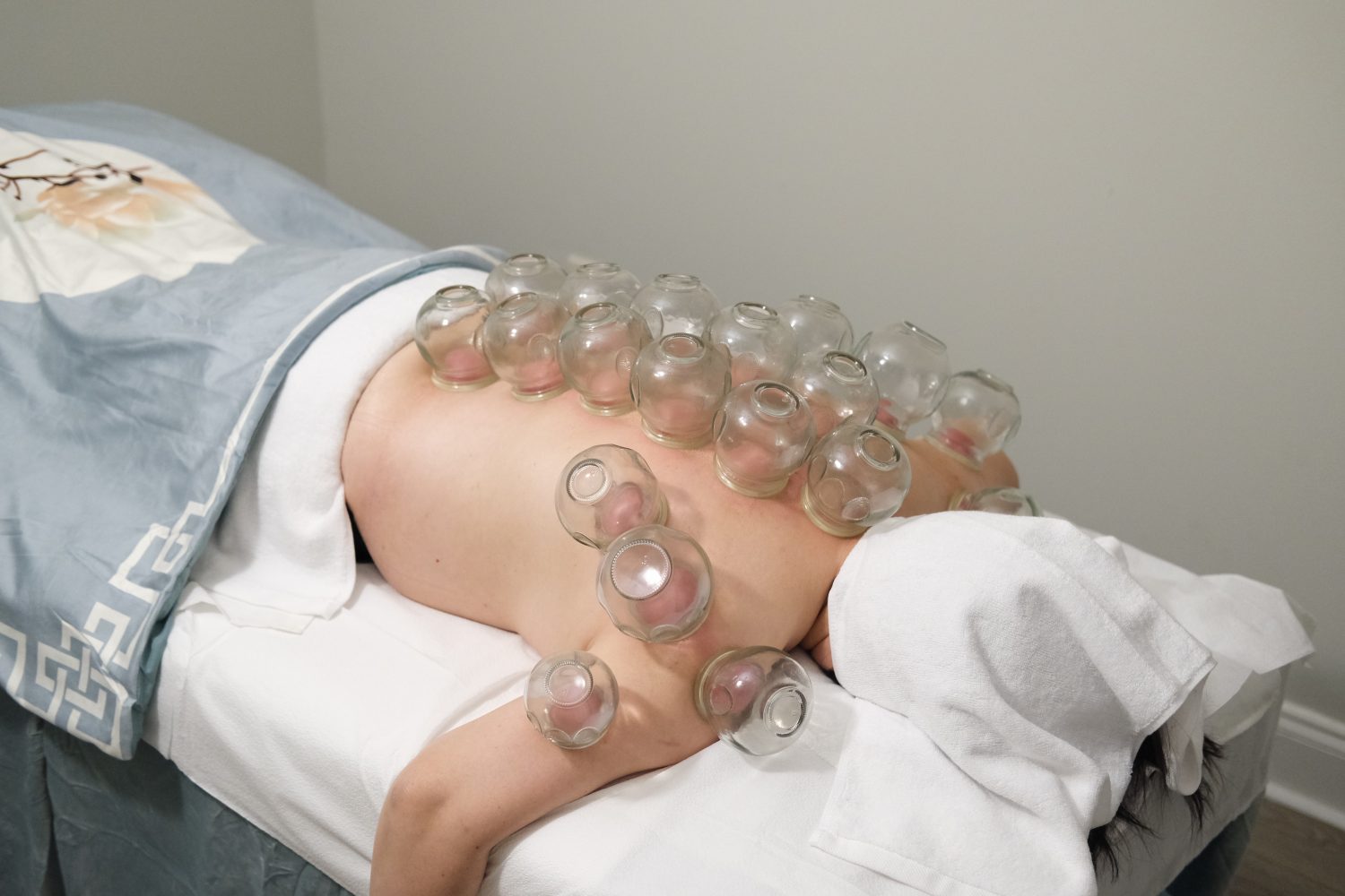 QC中医美容养生会所的理疗师在为顾客拔罐