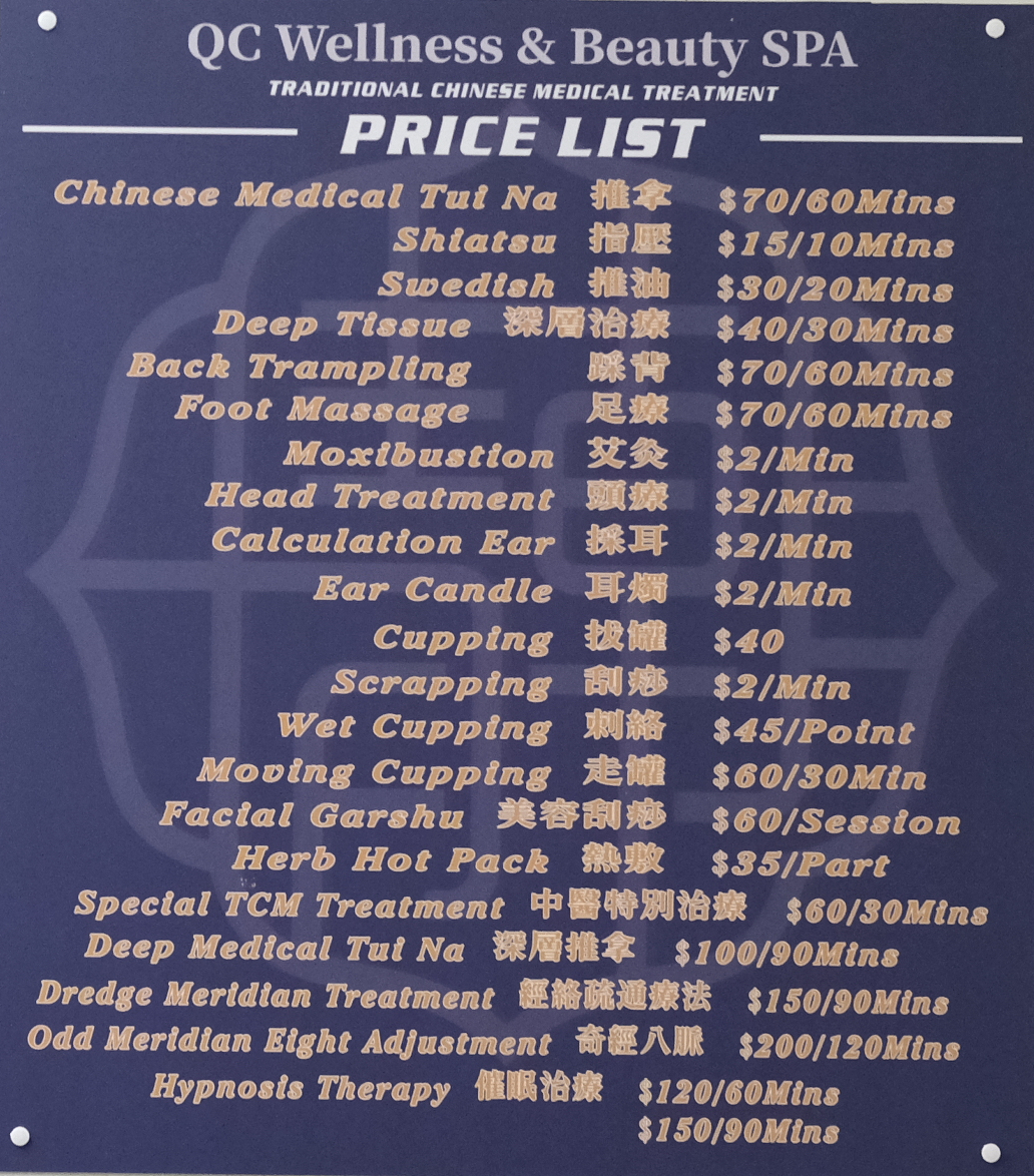 QC中医美容养生会所的服务项目包括:推拿、指压、推油、深层治疗、踩背、足疗、艾灸、头疗、采耳、耳烛、拔罐、刮痧、刺络、走罐、热敷、经络疏通疗法等。