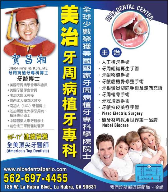 美治牙科中心賀昌湘牙醫博士,在校成績優異,於芝加哥西北大學及南加大最高分畢業,行醫多年,經驗豐富,是全球少有的牙周病專科醫師之壹,並於08丶09連續2年榮獲全美頂尖牙醫師(America’s Top Dentists)及美國國家牙周病院士最高榮譽(Diplomate, American Board of Periodontology)。