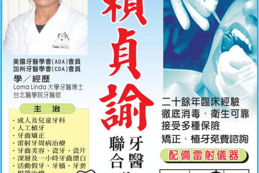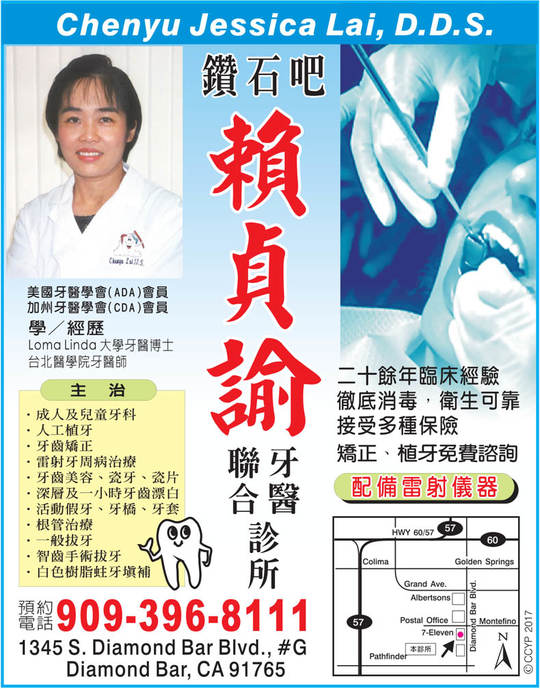 賴貞諭聯合牙醫診所 – Lai, Chenyu Jessica, D.D.S. 牙科,牙醫 909-396-8111 簡單介紹 主治: 成人及兒童牙科 根管治療 蛀牙填補丶牙齒矯正丶植牙 雷射牙周病治療 手術拔牙 牙齒美容 白色樹脂填補 瓷牙,瓷片 壹小時牙齒漂白 活勤假牙丶牙橋丶牙套