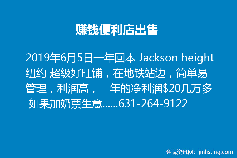 赚钱便利店出售 一年回本 Jackson height 纽约 超级好旺铺,在地铁站边,简单易管理,利润高,一年的净利润$20几万多, 如果加奶票生意会更盈利。业主另有其它业务,23万出售! 一年回本!先到先得!机不可失!仅限买家 请联系 Jessy 631-264-9122