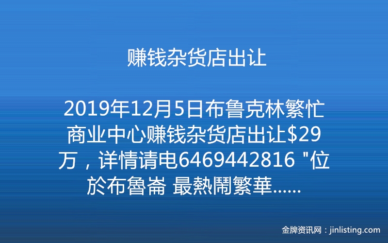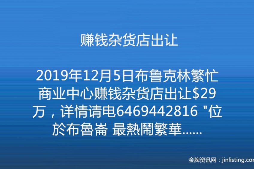 布鲁克林繁忙商业中心赚钱杂货店出让$29万,详情请电6469442816 “位於布魯崙 最熱鬧繁華商業街 门口公车站 近地鐵 店面1500+(地下室1800尺) 杂货年营70万 +六合彩年营92万 租金$5300租約7+5年 20年老店 两年回本 生意穩定 详情咨询6469442816Sharon 欢迎合作转发”
