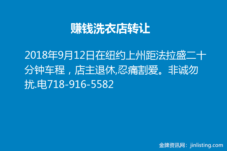 赚钱洗衣店转让 在纽约上州距法拉盛二十分钟车程,店主退休,忍痛割爱。非诚勿扰.电718-916-5582
