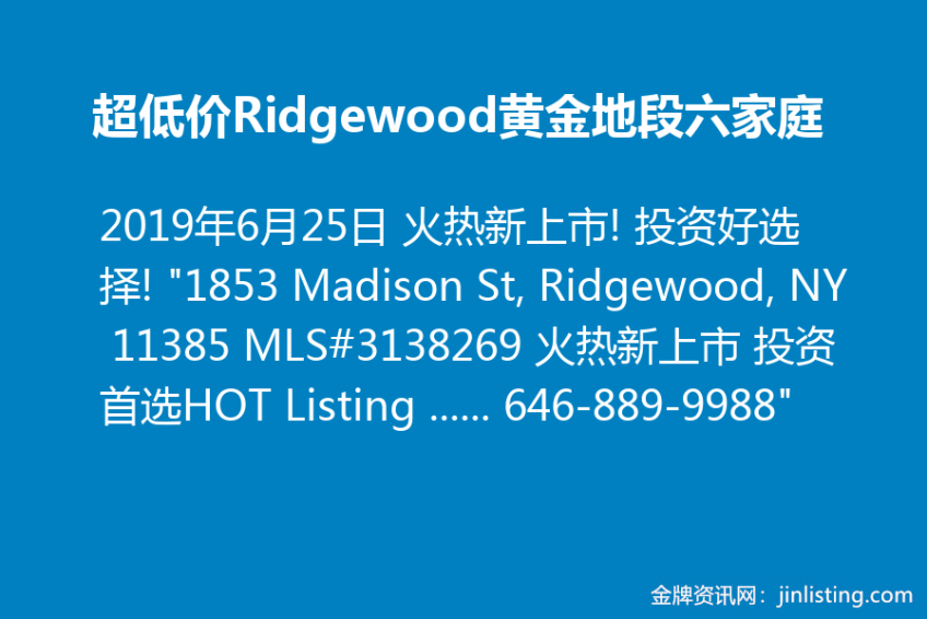 超低价Ridgewood黄金地段六家庭,火热新上市! 投资好选择! “1853 Madison St, Ridgewood, NY 11385 MLS#3138269 火热新上市 投资首选HOT Listing 盛世地产独家 超低价Ridgewood黄金地段六家庭,房27.5’ X 68’,地面三层,每家庭3卧1卫。保养佳,7年新锅炉,好管理。三分钟步行地铁站,地铁25分钟直达曼哈顿。旁边一条街是Myrtle Ave,餐馆超市商店银行应有尽有,生活便利。仅售$138万8 (as is, with tenants) 欢迎合作!Barbie Li 646-889-9988”
