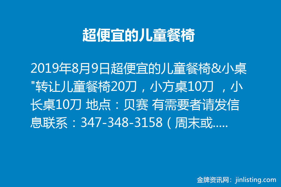 超便宜的儿童餐椅&小桌 “转让儿童餐椅20刀,小方桌10刀 ,小长桌10刀 地点:贝赛 有需要者请发信息联系:347-348-3158(周末或下午6点后可电话),谢谢!”